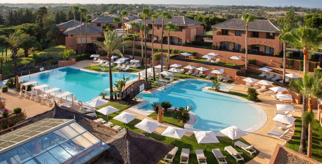 Lo que nos encanta: su concepto adults-only auténtico, el acceso ilimitado al circuito termal, la gastronomía de calidad incluida y la cercanía al Parque Natural de Doñana para excursiones en pareja.