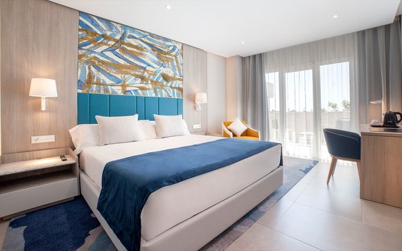 Moderna y elegante, la habitación Deluxe Premium está equipada con todo lo que necesitas para descansar y desconectar por completo en un espacio amplio decorado con toques mediterráneos.