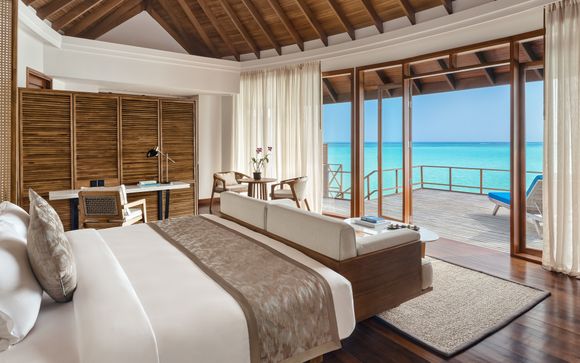 Suspendido sobre aguas cristalinas, encuentra el lugar perfecto para contemplar el resplandeciente amanecer maldivo. Contempla el paisaje a través de las ventanas de cristal del suelo al techo mientras descansas en tu cama king size. Disfruta de la intimidad de una terraza privada.