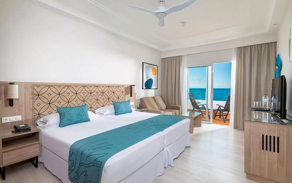 Pasa maravillosas noches con el sonido de las olas de fondo en tu elegante habitación Doble con vista lateral al mar y disfruta de momentos de sol con una taza de café en tu terraza.